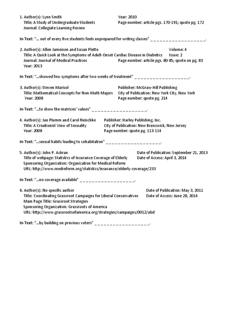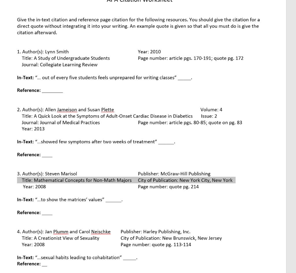 Apa Citation Worksheet Give The In Lent Citation And Reference Pag